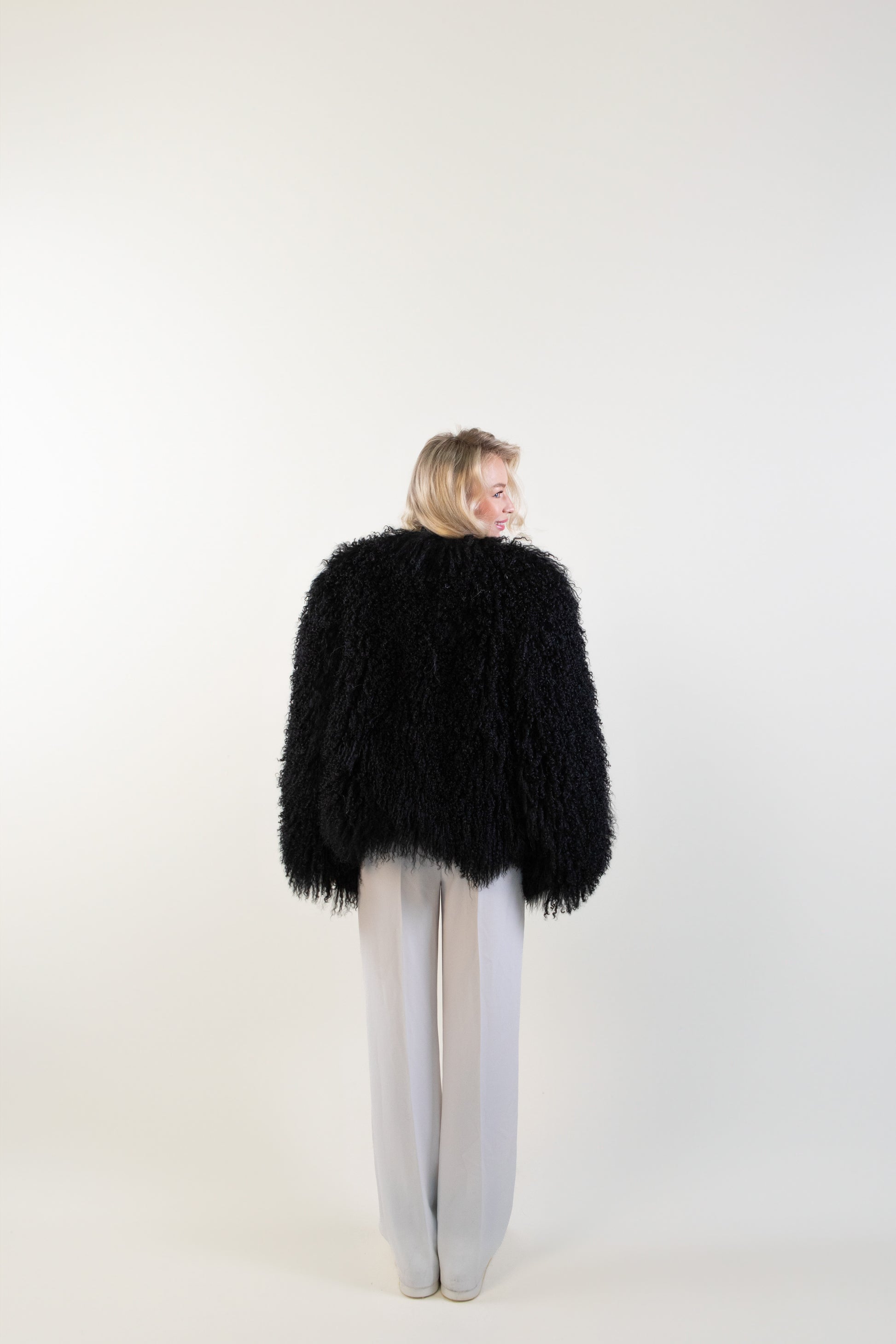Náš Mongolian Sheep Coat je kousek, který okamžitě zaujme svou nadýchanou, jemně kudrnatou texturou. Kožešina z mongolské ovce je lehká, měkká a vytváří ikonický „cloud effect“, díky kterému působí kabát étericky a žensky.